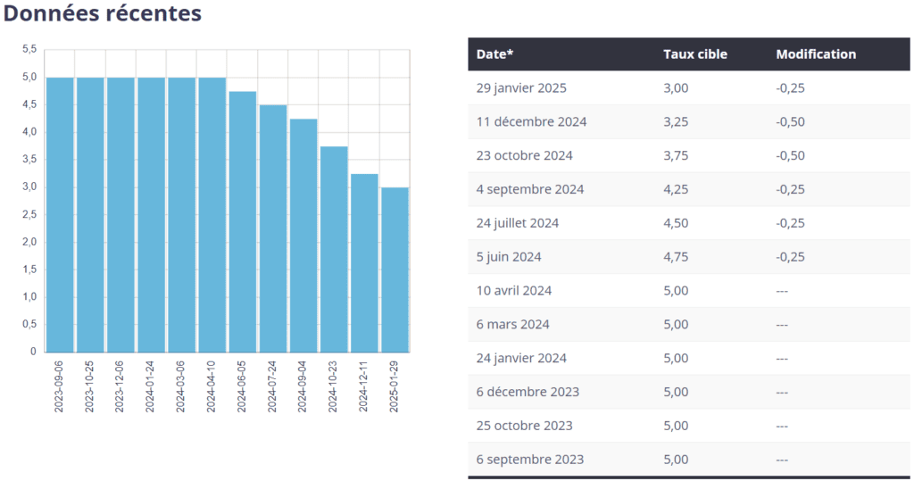 Le 29 janvier 2025, la Banque du Canada (BdC) a décidé de réduire son taux directeur à 3 % avec une nouvelle baisse de 25 points de base. Il s’agit d’une sixième baisse consécutive. De plus, elle annonce la fin du resserrement quantitatif afin que son bilan se stabilise et se mette ensuite à croître au rythme de la croissance de l’économie. Depuis le mois de juin 2024, le taux directeur de la BdC est passé de 5 % à 3 %.