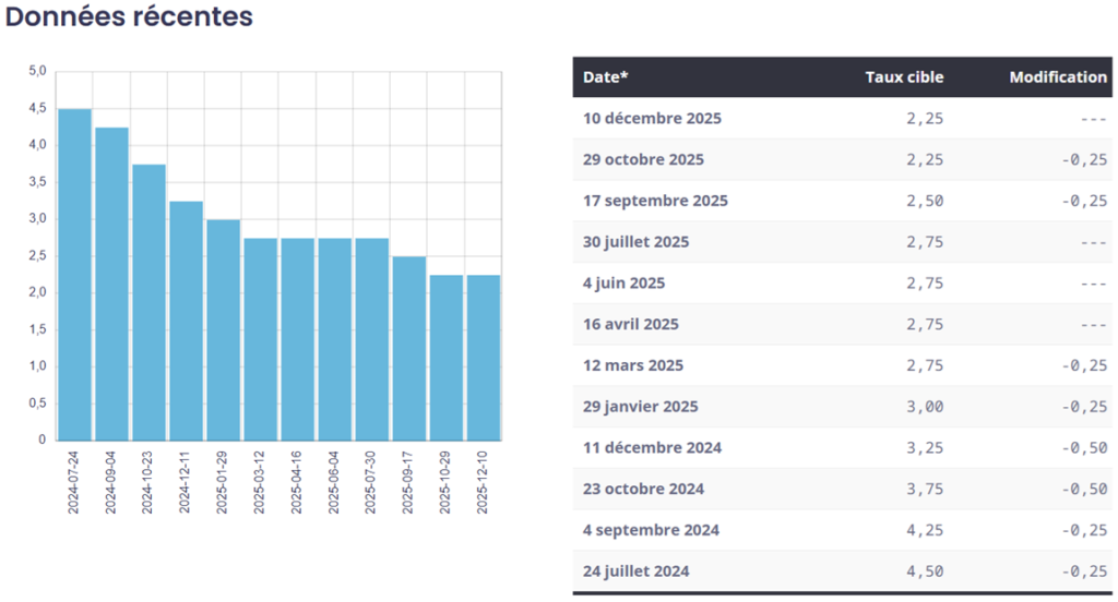 Le 10 décembre 2025, la Banque du Canada (BdC) a annoncé qu’elle maintenait son taux directeur à 2,25 %.