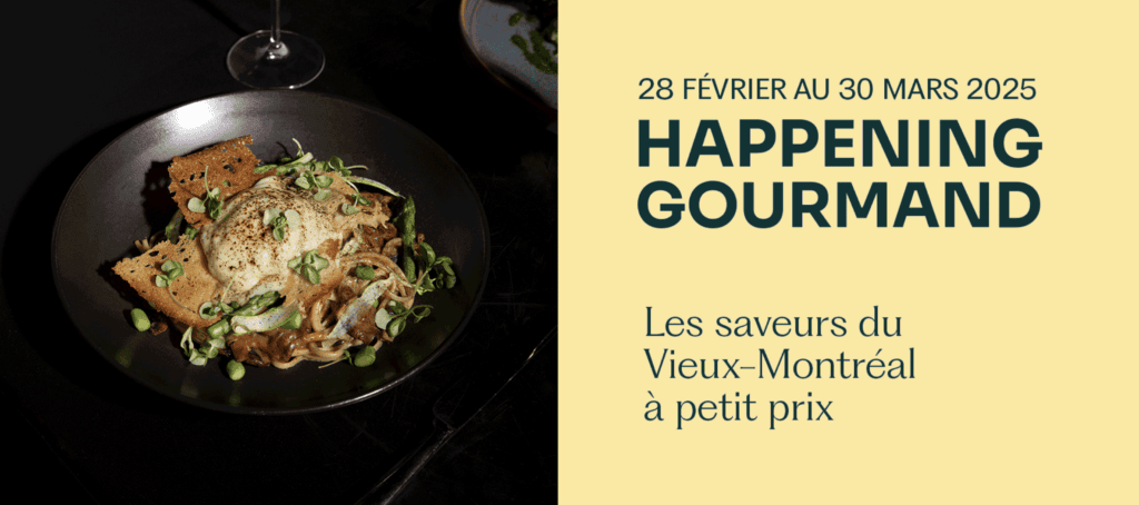 La 17e édition du Happening Gourmand se déroulera du 28 février au 30 mars 2025 dans divers restaurants du Vieux-Montréal. Ce quartier pittoresque ajoute un charme historique à votre expérience culinaire. Vous pourrez ainsi allier découverte culturelle et plaisirs de la table.