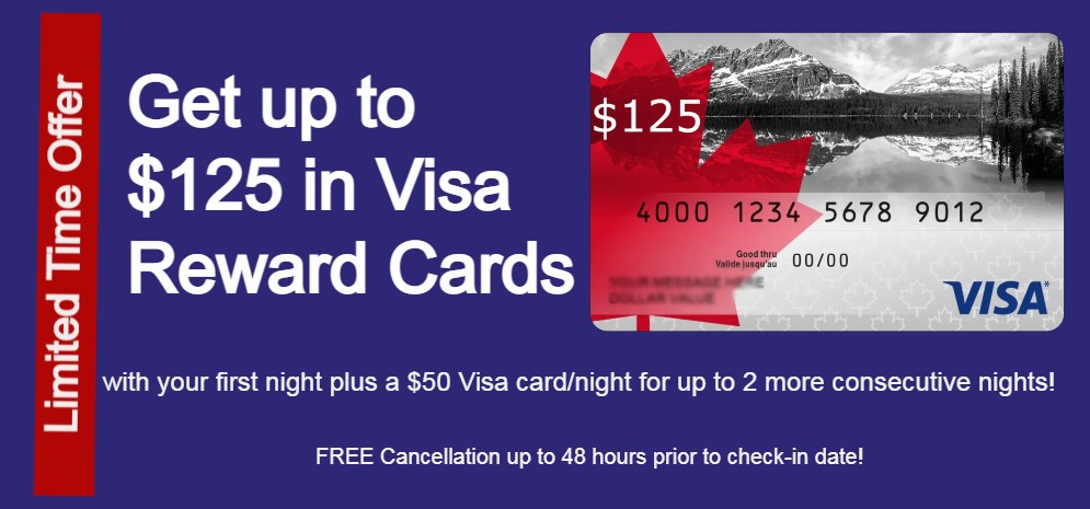 Ainsi, grâce à cette promotion, vous obtenez jusqu’à 250 $ de cartes-cadeaux prépayée Mastercard. Le séjour de deux nuits consécutives rapporte 150 $, 200 $, 225 $ ou 250 $ en cartes prépayées Mastercard, selon l’hôtel participant.