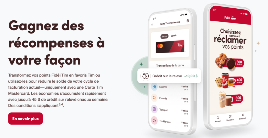 Les deux cartes vous permettent d’accumuler des points FidéliTim sur tous vos achats, que vous pouvez ensuite échanger contre des articles du menu Tim Hortons ou des crédits de relevé. De plus, les deux cartes sont assorties de quelques avantages en matière de protection des consommateurs.