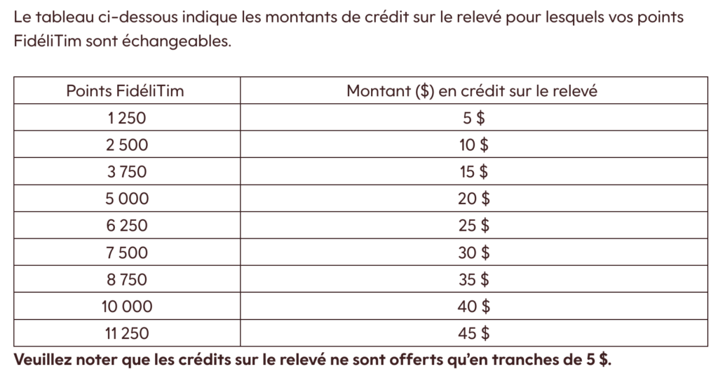 Ces points peuvent ensuite être échangés chez Tim Hortons une fois que vous avez accumulé suffisamment de points pour acheter le plat au menu de votre choix.