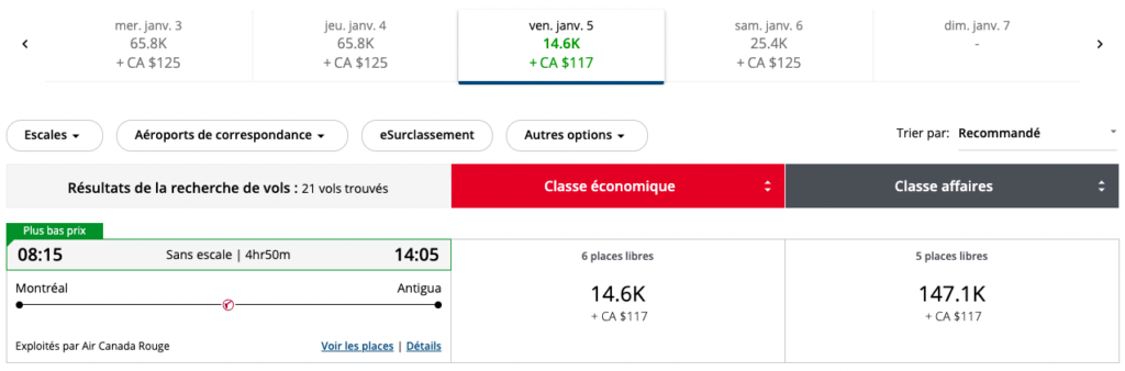 Les tarifs en points Aéroplan vers Antigua-et-Barbuda sont très raisonnables. Voici un exemple d’aller-retour à partir de Montréal en janvier 2024 pour 29 200 points Aéroplan et 169 $ de frais et taxes.