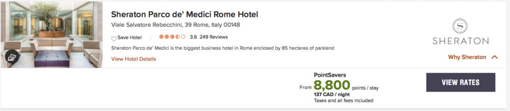 Par exemple, certains établissements sont très abordables en points ou en argent comme cet hôtel à Rome.