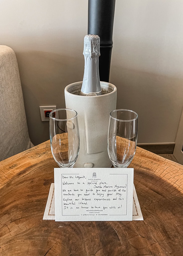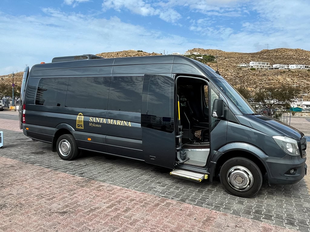 Santa Marina, un resort The Luxury Collection, offre un service de navette depuis l’hôtel vers le (nouveau) port ou l’aéroport et vice versa. À notre arrivée au port, le chauffeur s’est rapidement occupé de nos bagages. Il a joué les guides touristiques pendant la quinzaine de minutes que dure le trajet entre le port et l’hôtel, nous soulignant les différents points d’intérêts de l’île de Mykonos sur notre chemin.