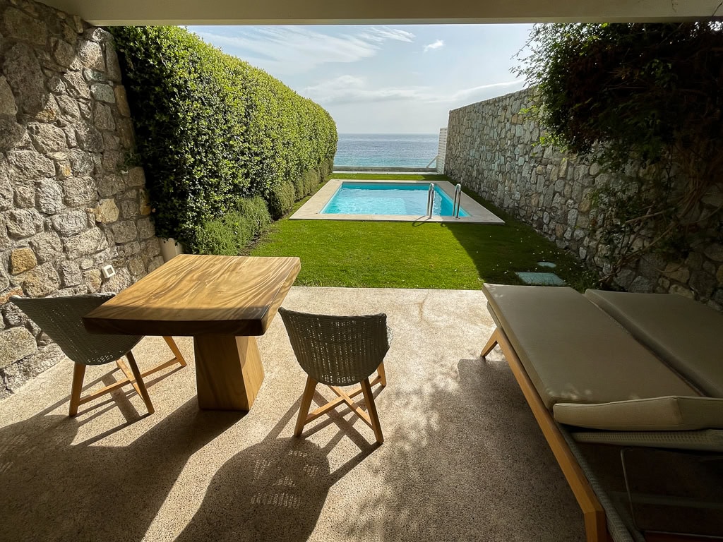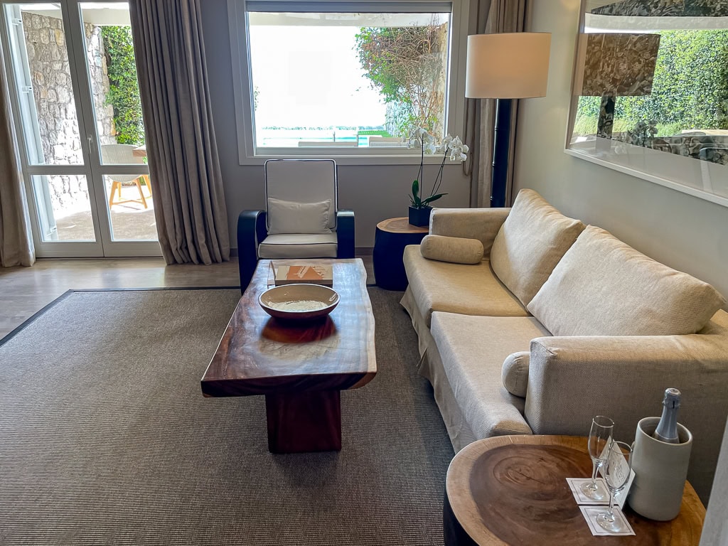 Vient ensuite l’espace salon / bureau où on a pris soin de laisser une bouteille de champagne dans un seau de glace comme cadeau. Cet espace peut être isolé de la chambre au moyen de grandes portes en bois massif. Finalement, le clou du spectacle : la terrasse et sa magnifique piscine privée !