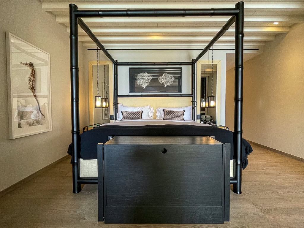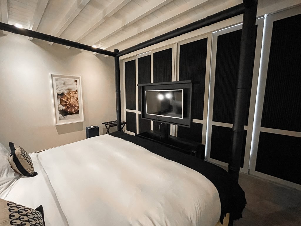 En bout de corridor, on retrouve la chambre avec son imposant lit à colonnes de taille « king size » avec à son bout un téléviseur dans un caisson de bois. D’imposantes tables de chevet sont situées de chaque côté et les murs sont ornés de photos sur la thématique de la plage.
