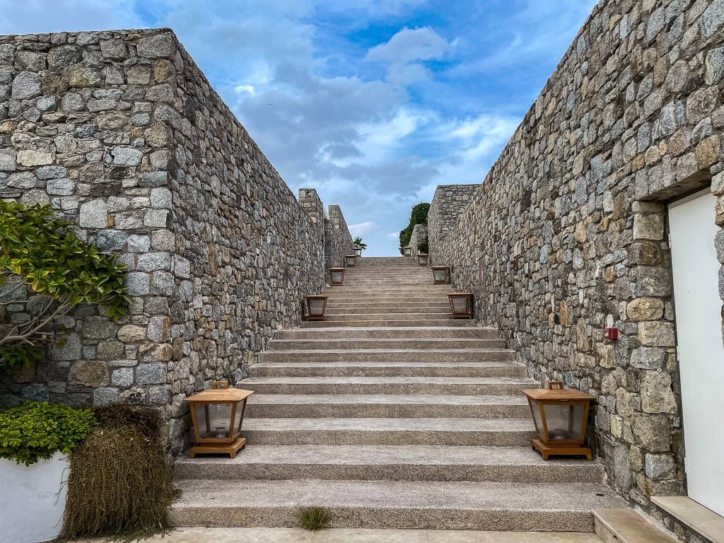 Santa Marina, un resort The Luxury Collection présente une véritable plage privée, étant isolée d’un côté par une falaise et de l’autre par une barrière donnant sur une jetée menant à un petit phare. Du mobilier est installé tout le long de cette jetée, qui sert d’extension à la plage.