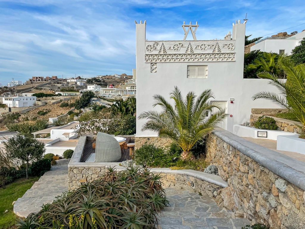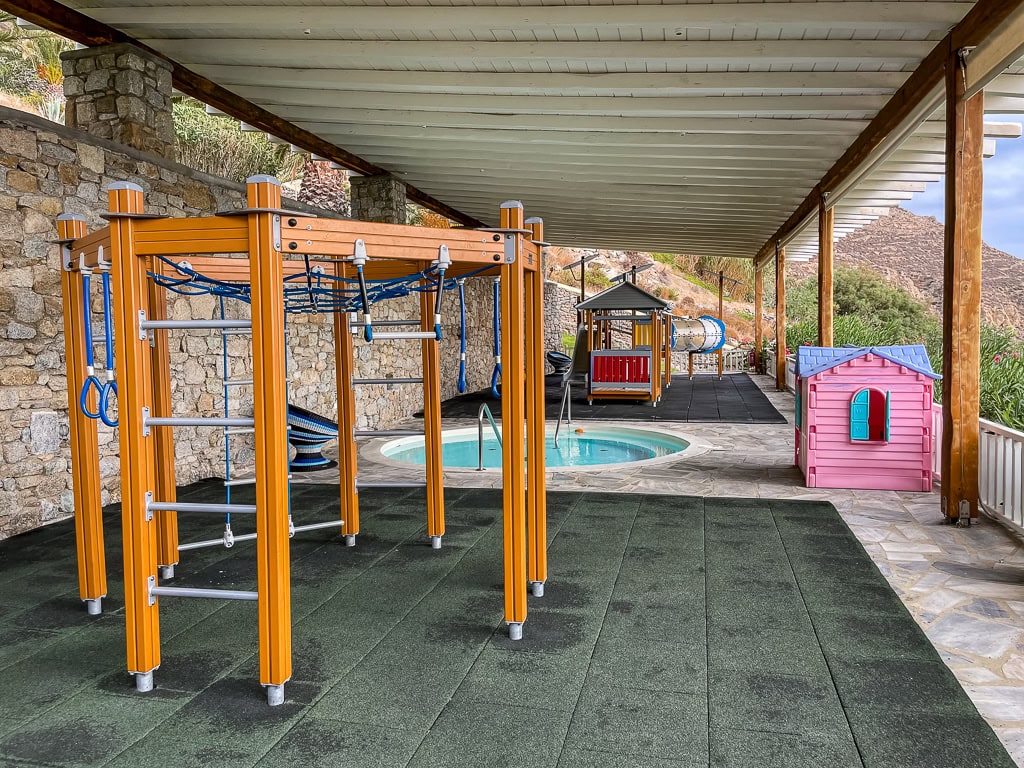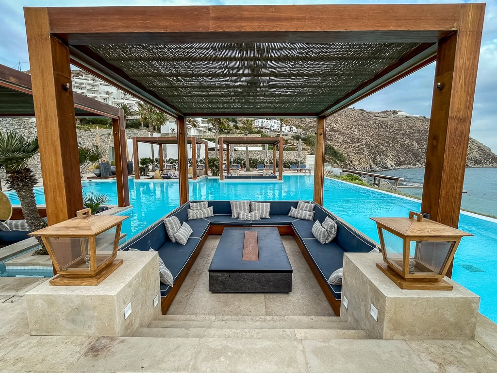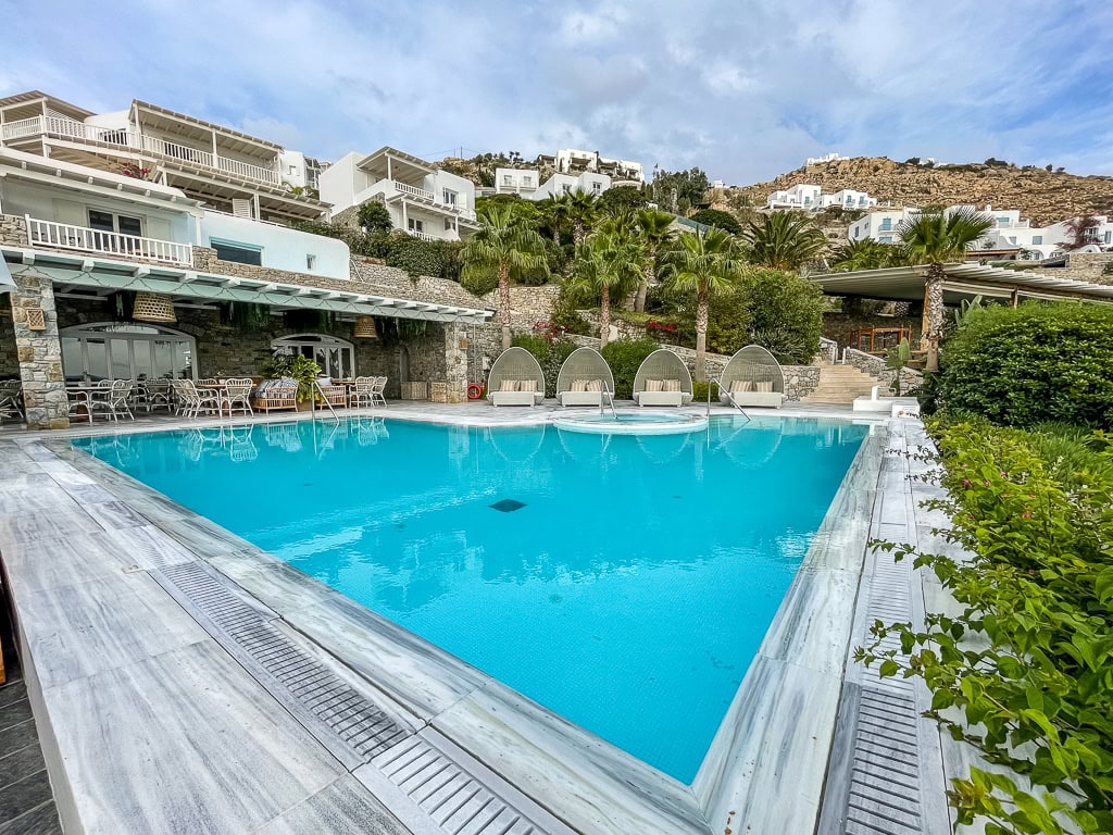 Trois piscines sont accessibles à l’ensemble des clients de l’hôtel : une piscine centrale à débordement présentant une vue à couper le souffle sur la baie d’Ornos et autour de laquelle il y a des aires de repos et des balançoires ; une piscine avec chaises longues et bain à remous à proximité du restaurant Elias et une dernière située à l’intérieur d’une aire de jeu destinée aux enfants où un sauveteur est de garde pendant ses heures d’ouverture. Les villas et certaines suites disposent de piscines privées.