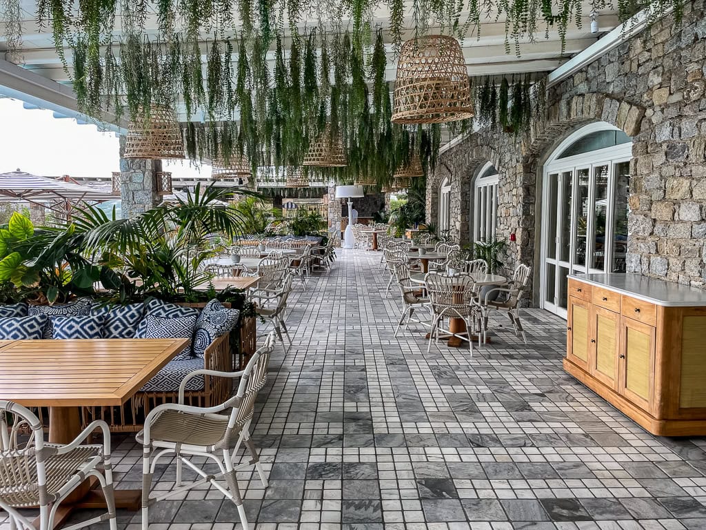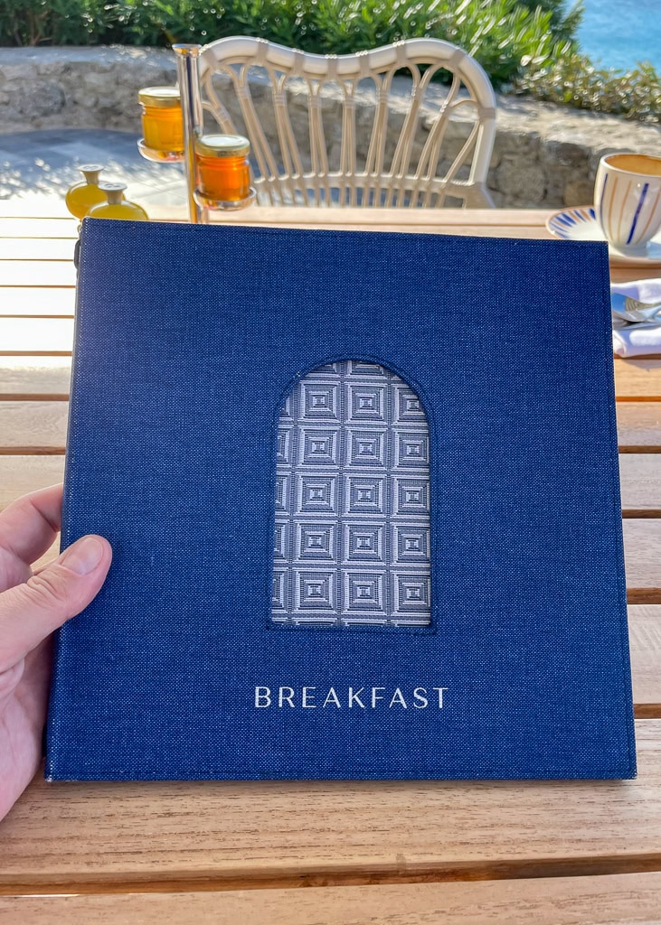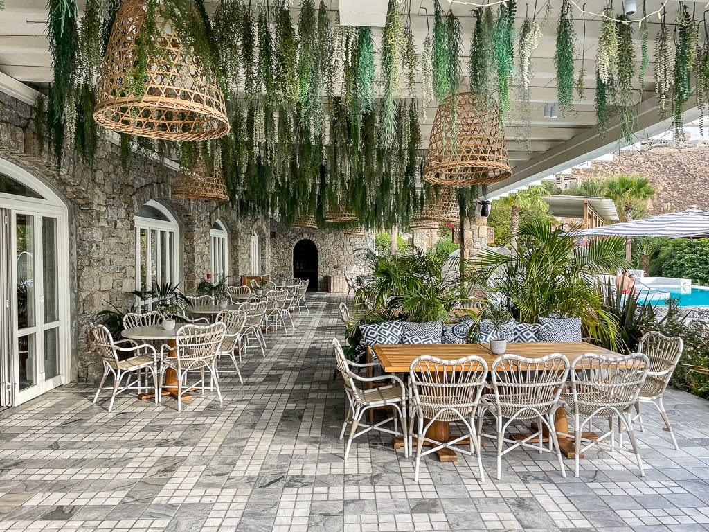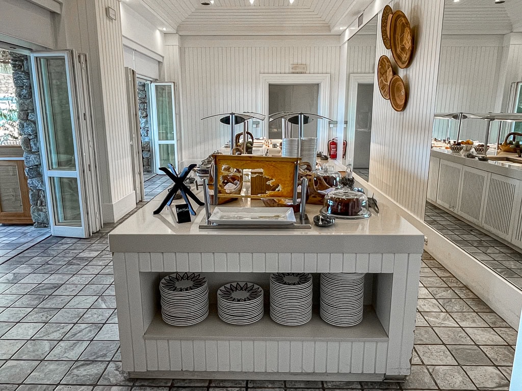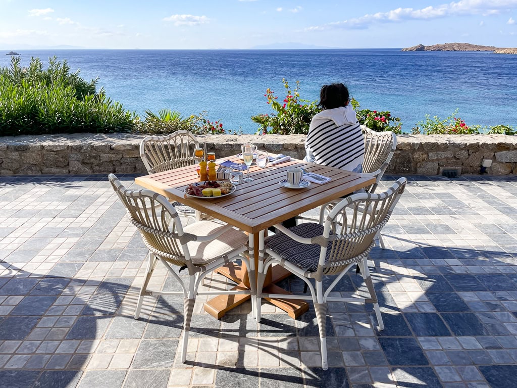 Le déjeuner, offert aux membres du programme Marriott Bonvoy ayant un statut Platinum ou supérieur, est servi dans l’enceinte du restaurant Elais, qui présente une magnifique terrasse avec vue sur la baie d’Ornos ornée de mobilier en bois et de grands parasols. Outre le buffet, un court menu à la carte est offert.