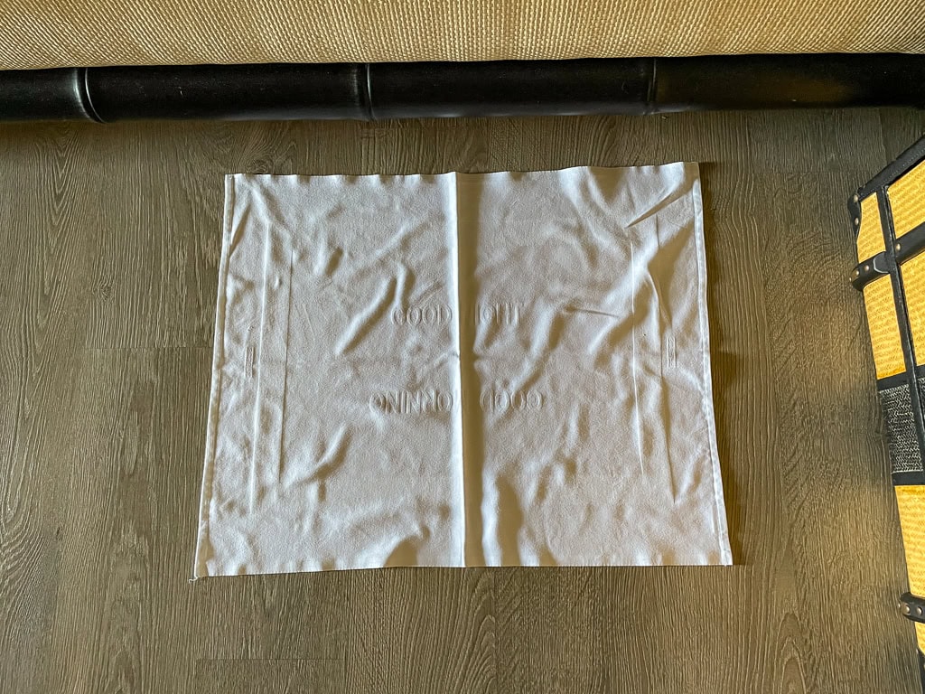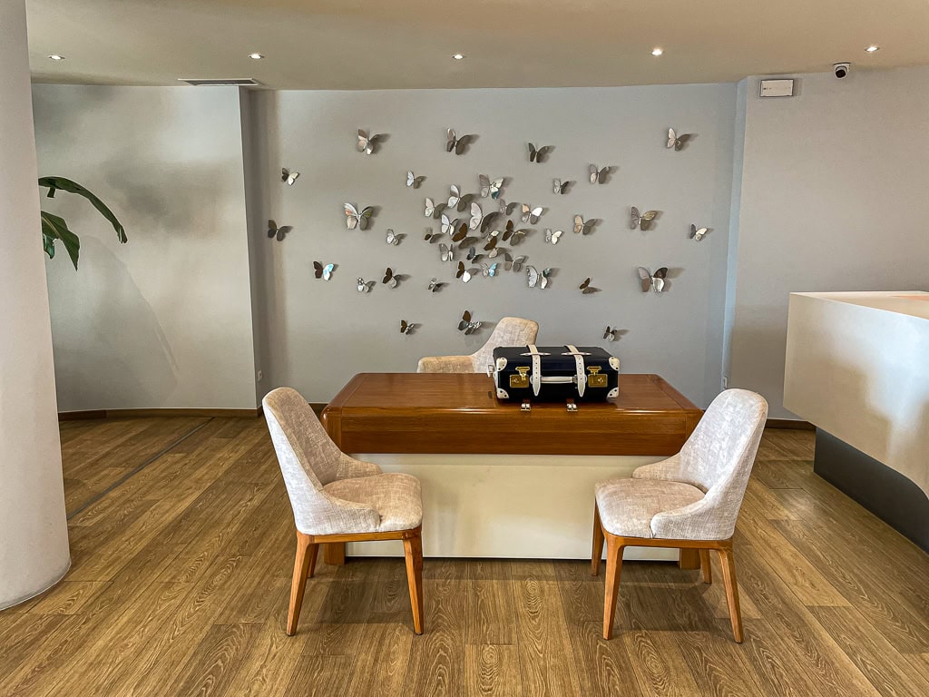 Au comptoir d’enregistrement, l’agent confirme les détails de la réservation et me remercie pour ma loyauté à la chaîne hôtelière. Au moment de faire mon choix de cadeau de bienvenue, il m’explique que l’hôtel fermera le 14 octobre pour la saison morte et que l’offre alimentaire du buffet sera limitée, alors il m’offre gracieusement les déjeuners. Il m’offre alors le choix entre 1 000 points bonis ou un coffret à maquillage avec broderies à l’effigie de l’hôtel, que choisira mon épouse. L’agent annonce un surclassement en suite et demande à son collègue bagagiste de nous y conduire !