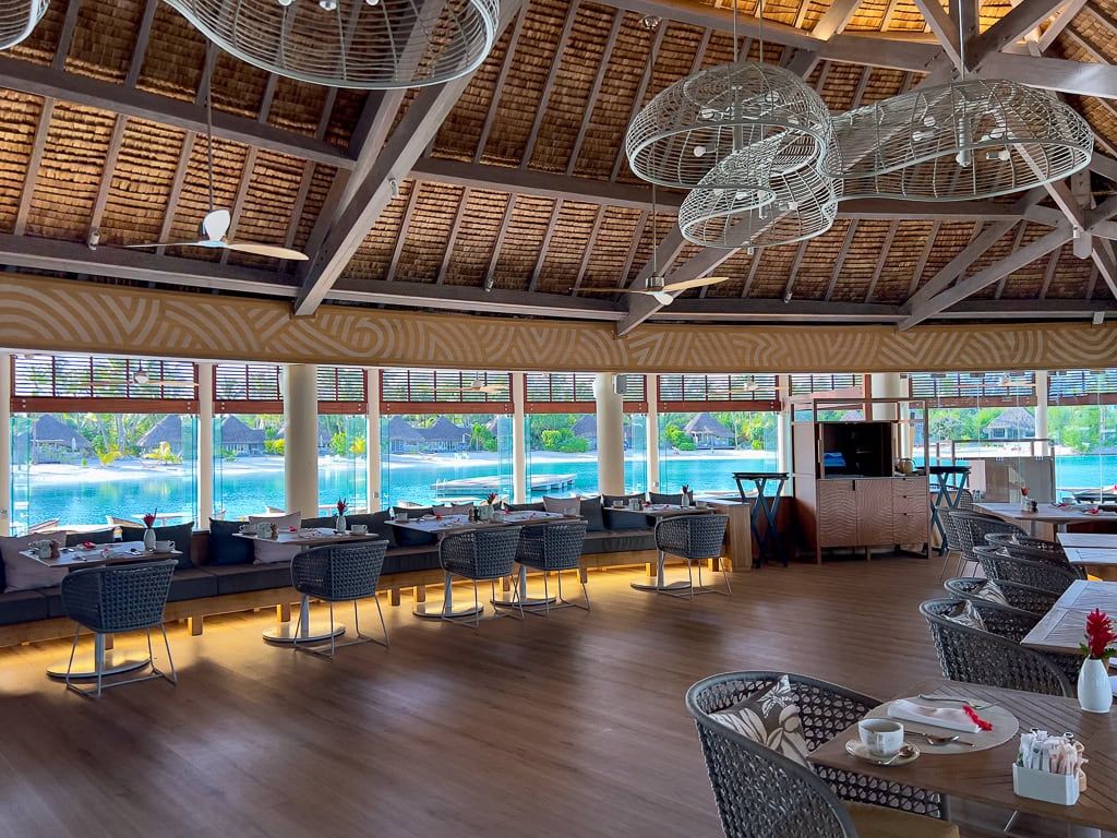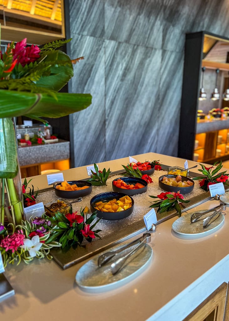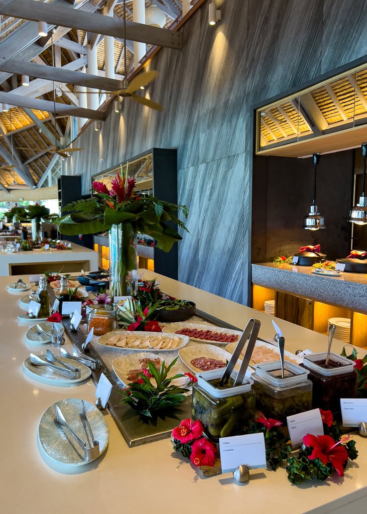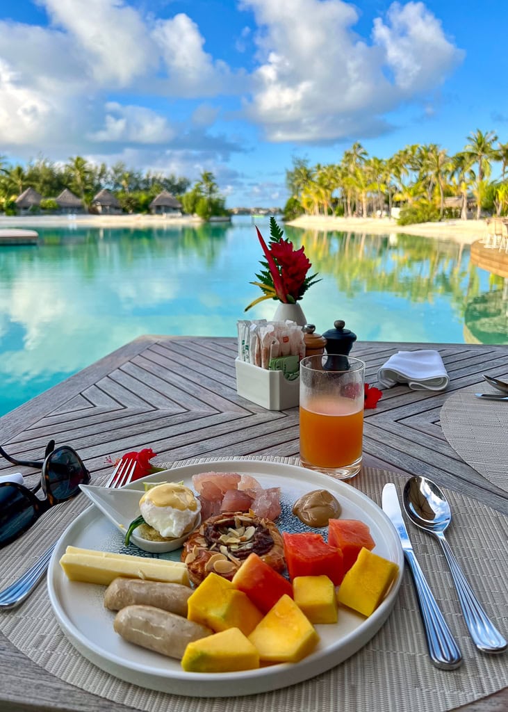Matin : Le petit-déjeuner copieux est offert gratuitement aux membres Platinum et supérieurs, au restaurant Tipanier. Pour les non-membres, le prix est d’environ 60 USD. On déguste ce festin au bord du lagon, avec la possibilité d’apercevoir des poissons et des raies (on a même aperçu deux requins à pointes noires!). Le buffet à volonté est délicieux et généreux, avec un accent sur les produits locaux et frais. Coup de cœur pour la salade tahitienne et les fruits tropicaux. Le personnel est courtois et chaleureux, ajoutant une touche agréable à l’expérience matinale.