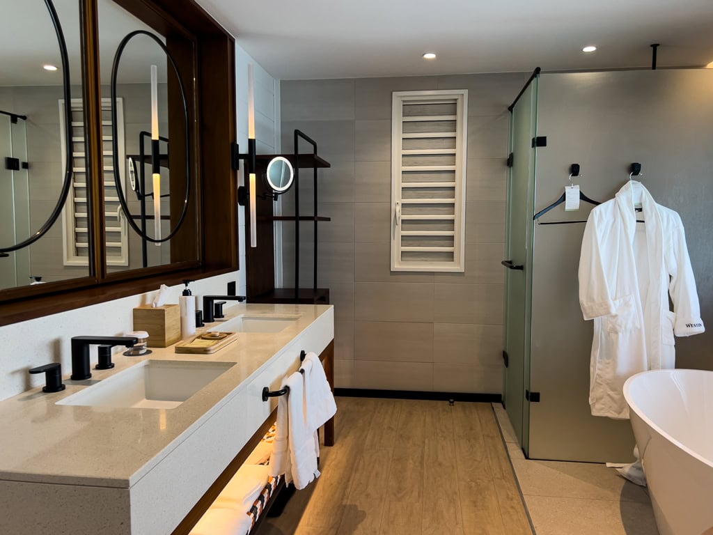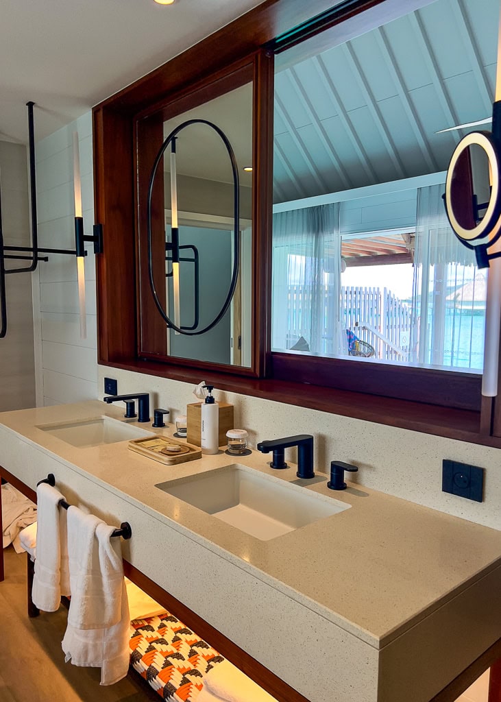 Quant à la salle de bain, celle-ci offre un espace considérable avec deux vanités. À noter que les miroirs sont judicieusement intégrés à des murs coulissants qui permettent de choisir entre intimité ou vue sur le lagon à partir de la salle de bain.