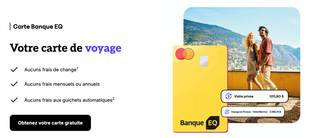 La carte Banque EQ est un choix judicieux pour voyager, car elle est largement acceptée dans le monde entier et ne prélève pas de frais de transaction à l’étranger (2,5 %) ni de frais de guichet automatique.