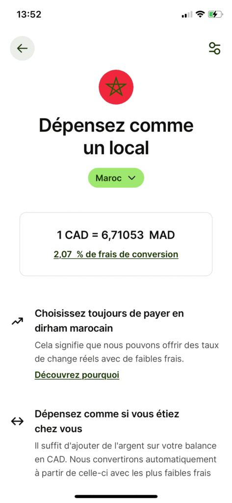 Évidemment, mon premier choix était toujours d’utiliser ma carte de crédit sans frais de conversion pour continuer d’accumuler des points de récompense en voyageant. J’ai principalement utilisé la Carte Visa Infinite Passeport Banque Scotia lors de ce voyage. Ma carte de débit Wise me servait donc d’outil essentiel lorsque ma seule option était de payer comptant, comme c’était souvent le cas au Maroc.