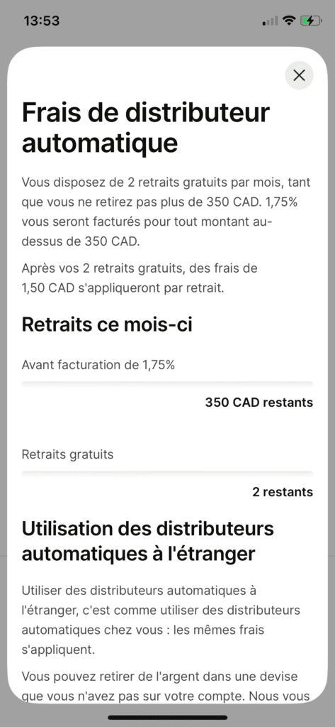 La carte est gratuite, mais vous devez déposer un minimum de 30 CAD lors de l’ouverture du compte. Les frais de conversion varient selon les pays : par exemple, ils sont de moins de 0,50 % en Europe et aux États-Unis, 0,72 % au Mexique et 1,48 % au Costa Rica. Lors des dépôts, différents frais s’appliquent selon la méthode choisie. Ceux-ci seront clairement affichés lorsque vous ajoutez des fonds sur votre carte. Pour les retraits, vous avez droit à deux retraits gratuits par mois jusqu’à 350 CAD au total. Au-delà, des frais de 1,50 CAD s’appliquent par retrait et 1,75 % sur les montants dépassant 350 CAD.