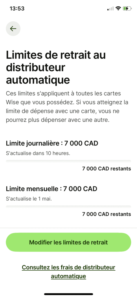 Wise vous informe également du montant que vous pouvez retirer sans frais de retrait. Leur application vous explique très clairement chaque frais dans cette section que je vous conseille d’explorer afin d’obtenir d’autres astuces pour économiser sur les retraits en devises étrangères.
