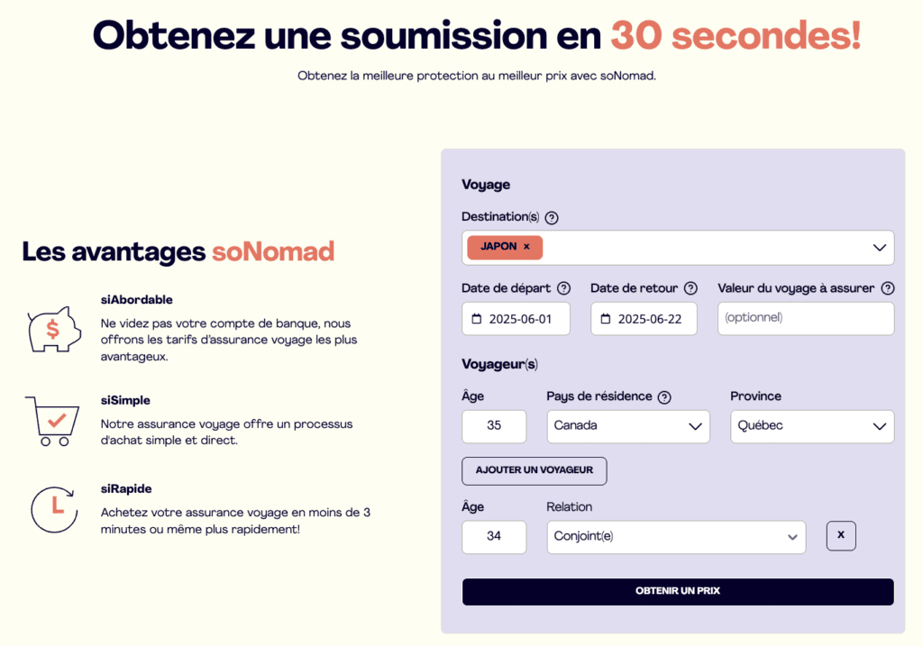 Afin que soNomad puisse proposer une soumission correspondant exactement aux besoins du séjour à l’étranger, la personne doit fournir quelques informations personnelles simples, tels que :