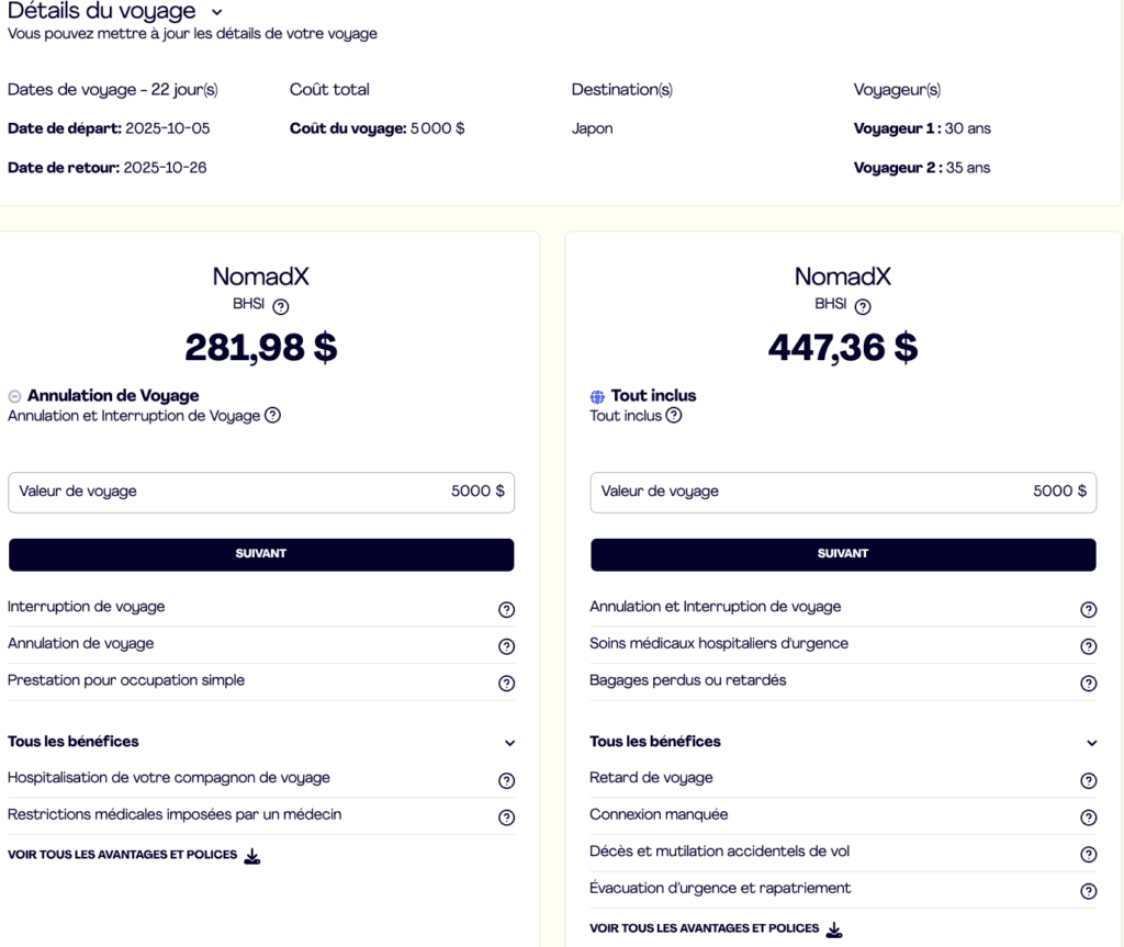 Ensuite, soNomad affiche les options d’assurance voyage :