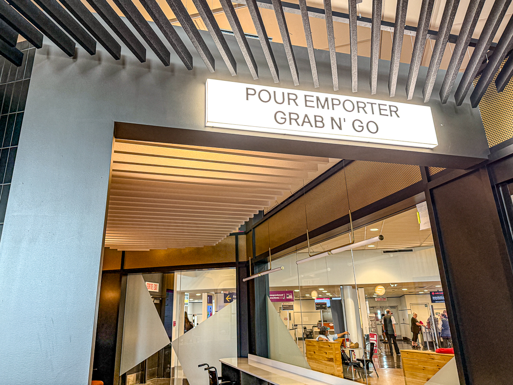 Il est situé tout près de Starbucks et YUL Pizza, entre les portes 1 et 2 après le contrôle de sécurité.
