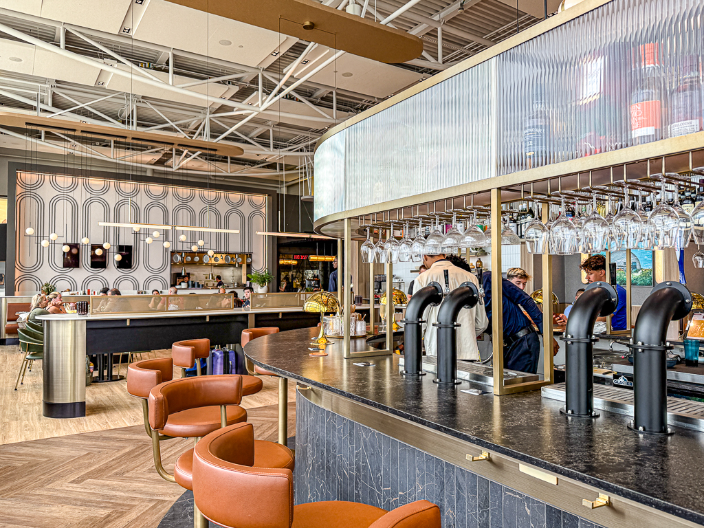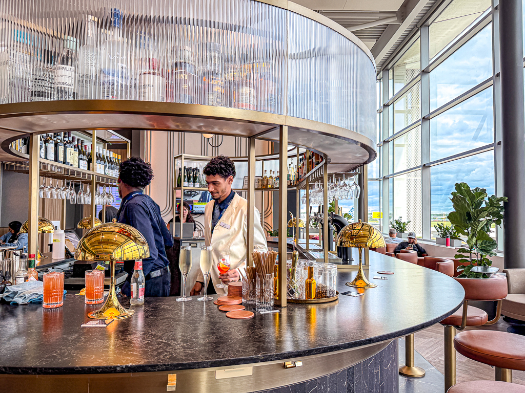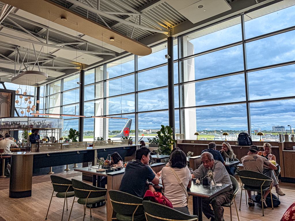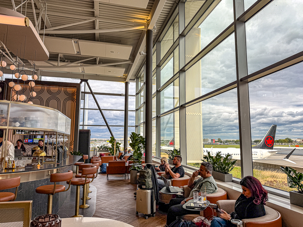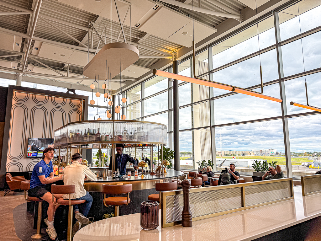 Le salon Aspire Amex à YUL est un grand espace ouvert avec un bar central qui donne une ambiance de restaurant montréalais et une fenestration qui donne une vue directe sur le tarmac.