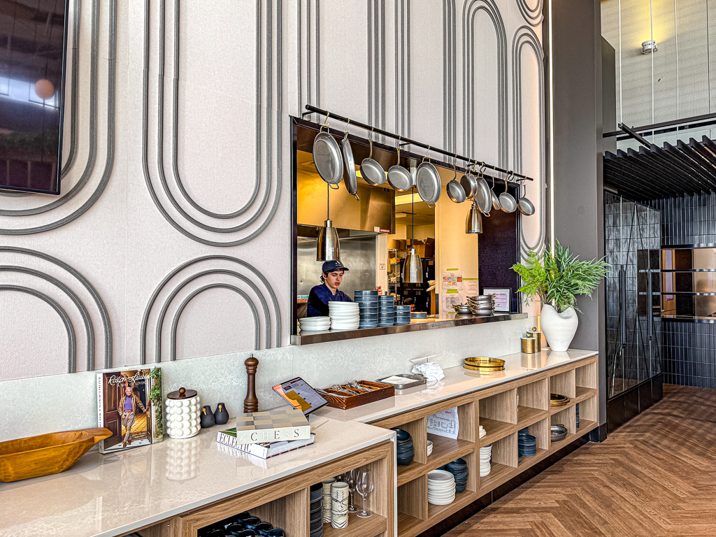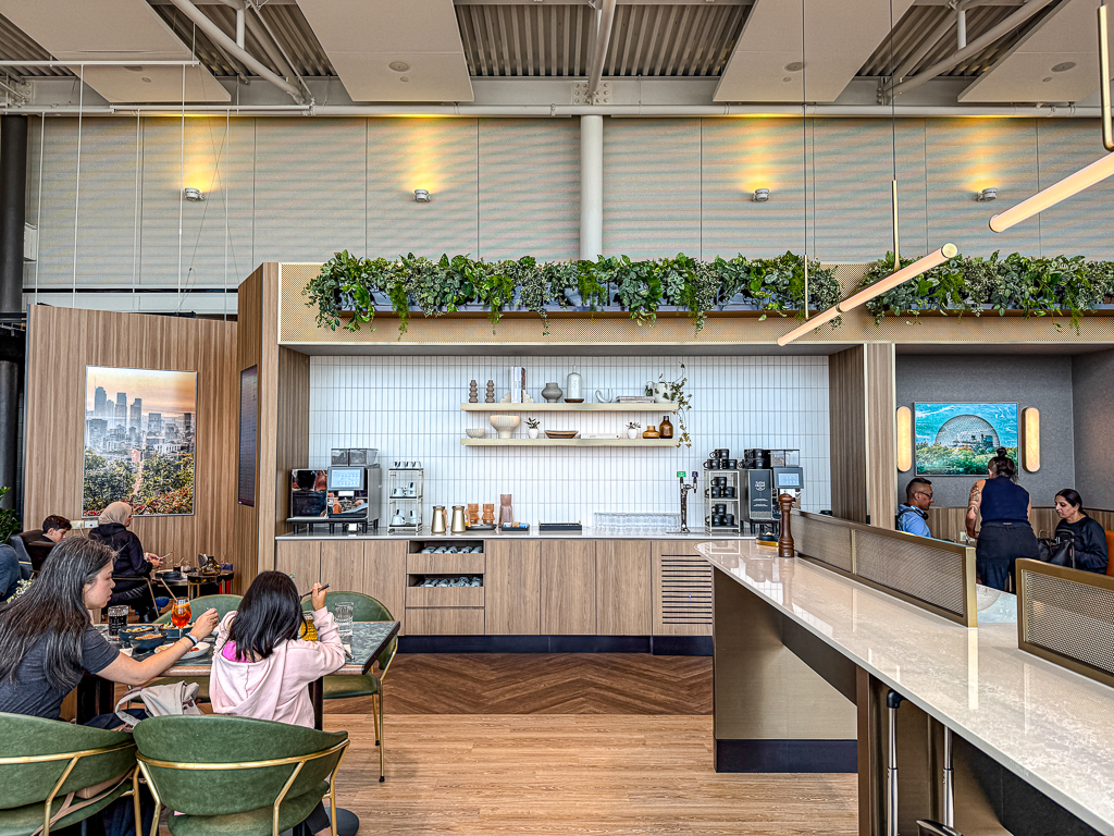 Le salon Aspire AMEX en zone domestique offre deux options : la section pour emporter tout juste à côté de la réception, ou la zone à la carte qui occupe la quasi totalité de l’espace. Lors de ma visite à 16 h 30, la zone pour emporter ne semblait offrir que du café; on m’a ensuite informé que cette zone était surtout ouverte et remplie d’items à attraper au passage pour les voyageurs du matin.