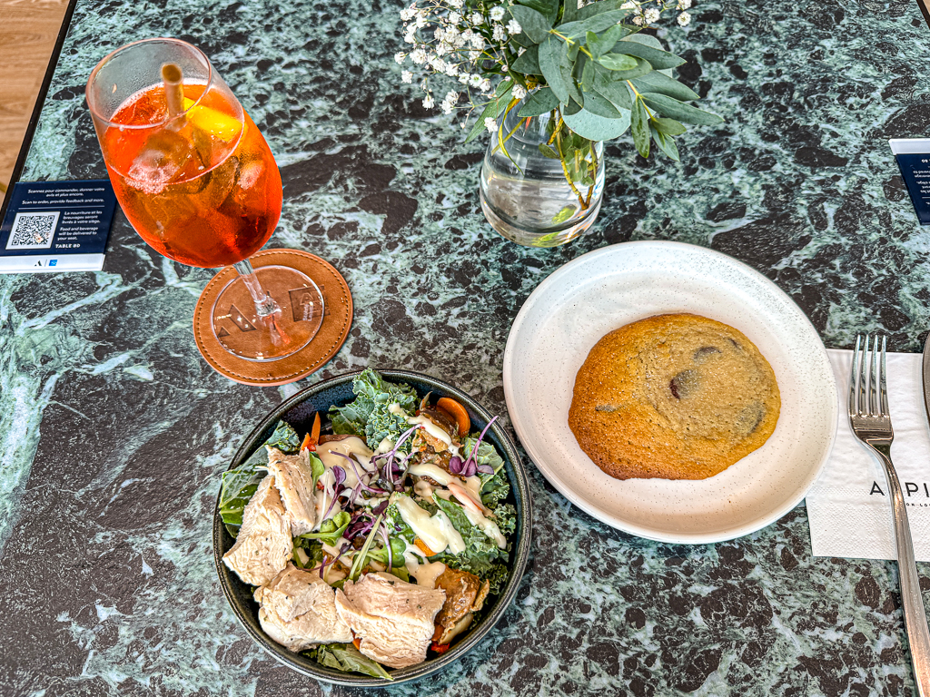 Le concept de restaurant à la carte intégré à un salon est une nouveauté à l’aéroport de Montréal, offrant une expérience rehaussée et un peu plus gastronomique. Les commandes sont effectuées à partir d’un code QR unique à sa table qui donne sur le menu complet dans lequel on retrouve des entrées, quelques plats principaux et desserts, ainsi qu’un service de bar avec différents cocktails et des bulles.