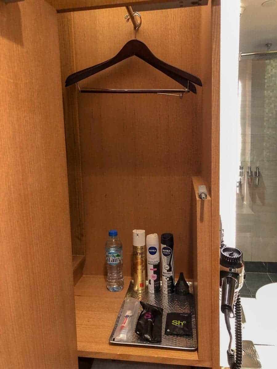 Tout est parfaitement propre et bien agencé. Il y a même des produits de toilettes à votre disposition (laque, déodorants et accessoires hygiéniques) ainsi qu’une bouteille d’eau.