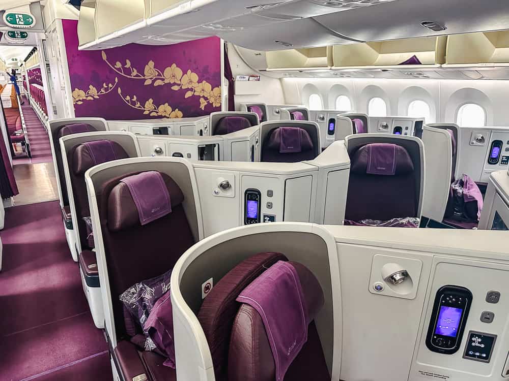 Après un vol à bord d’un A380 d’Emirates entre Dubai et Singapour, et une nuit au Westin Singapore, me voici en route pour Bangkok avec Thai Airways, dans la classe affaires de l’un de ses Boeing 787-9.