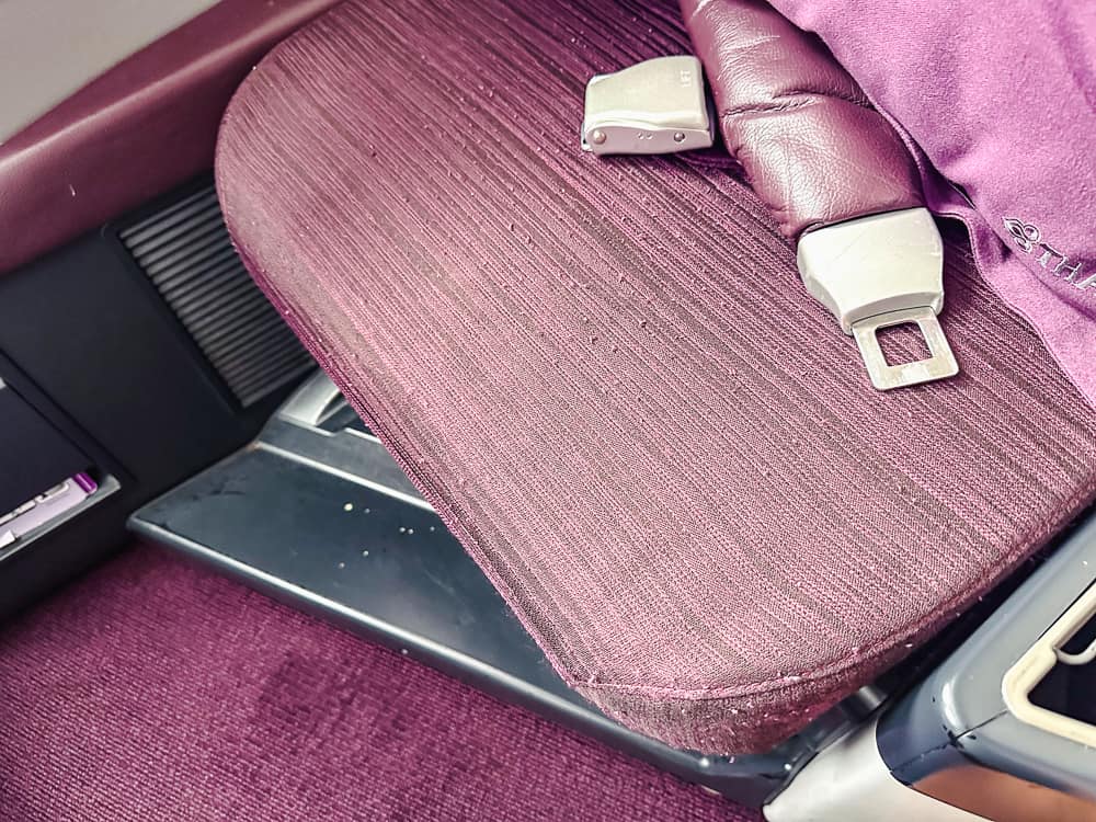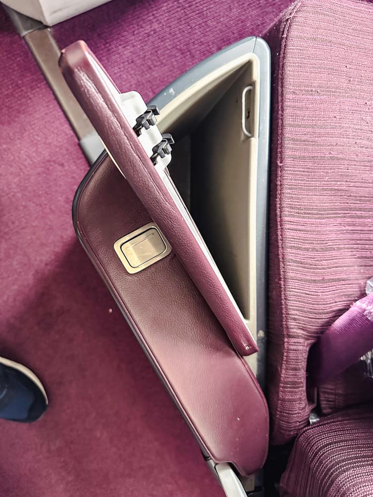 Bien que l’appareil ne soit pas le plus récent de la flotte Thai Airways, la cabine reste fonctionnelle et confortable pour un vol régional. Les tons de violet et de beige, signature de la compagnie, donnent une ambiance chaleureuse à l’ensemble.
