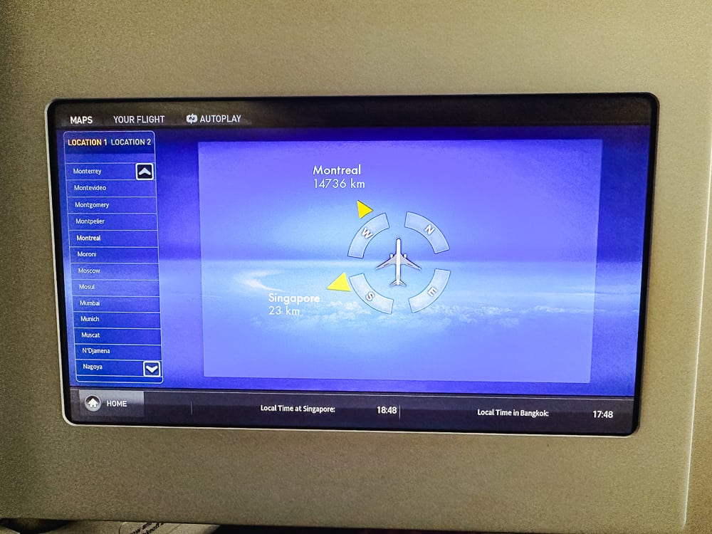 Pour ce court trajet régional entre Singapour et Bangkok, j’ai pu obtenir un siège en classe affaires pour seulement 20 000 points Aéroplan, plus les taxes et frais applicables. Ce même vol était également disponible en classe économique pour 8 000 points Aéroplan.