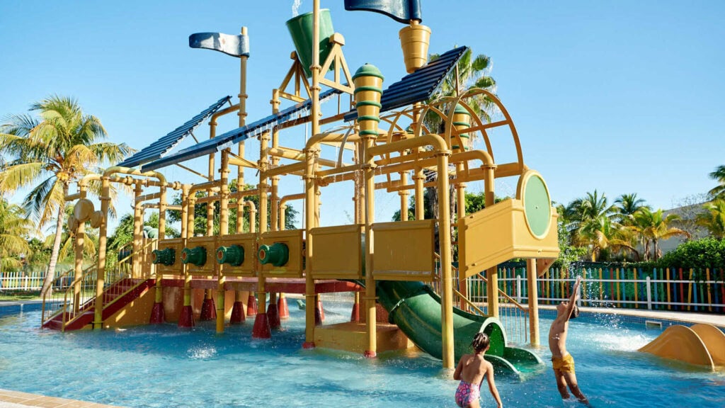 Families will enjoy a Pirates Island water park, kids’ club and teen activity center. The site features six pools, two of which are designed for children, and offers non-motorized water sports activities.