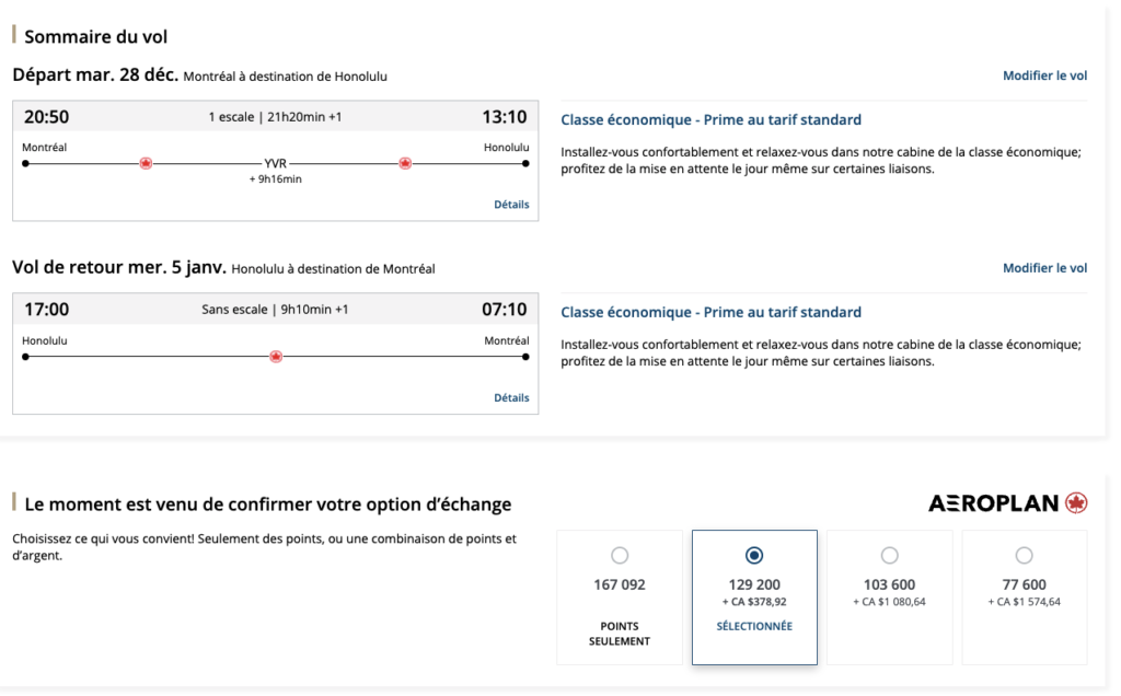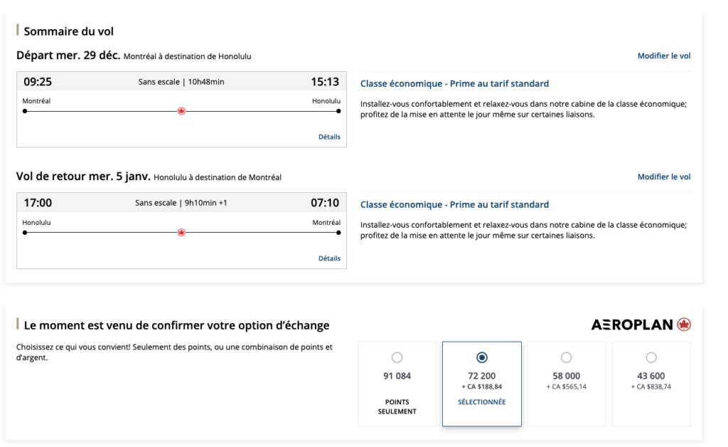 A trip for two to Maui between December 31 and January 14, 2023 costs 66,400 Aeroplan points and $330.