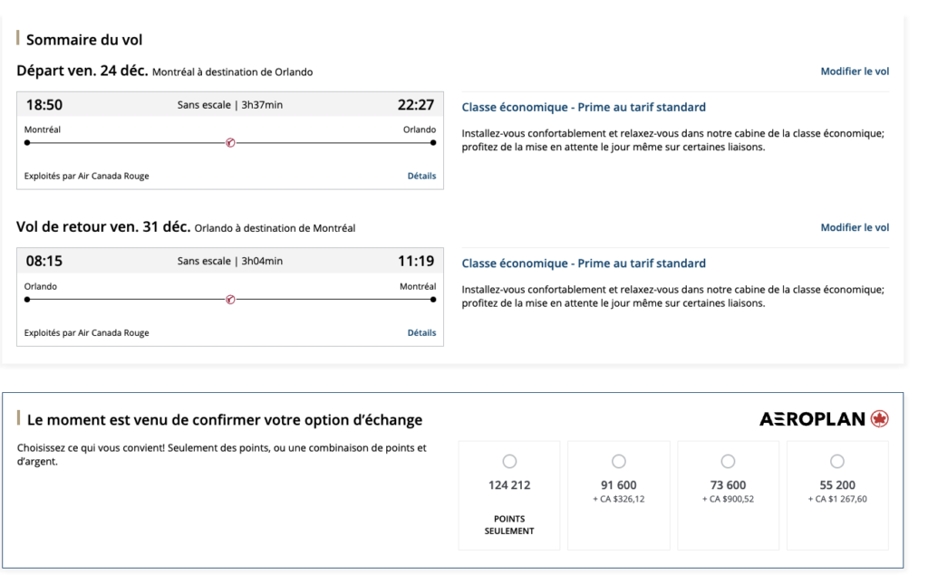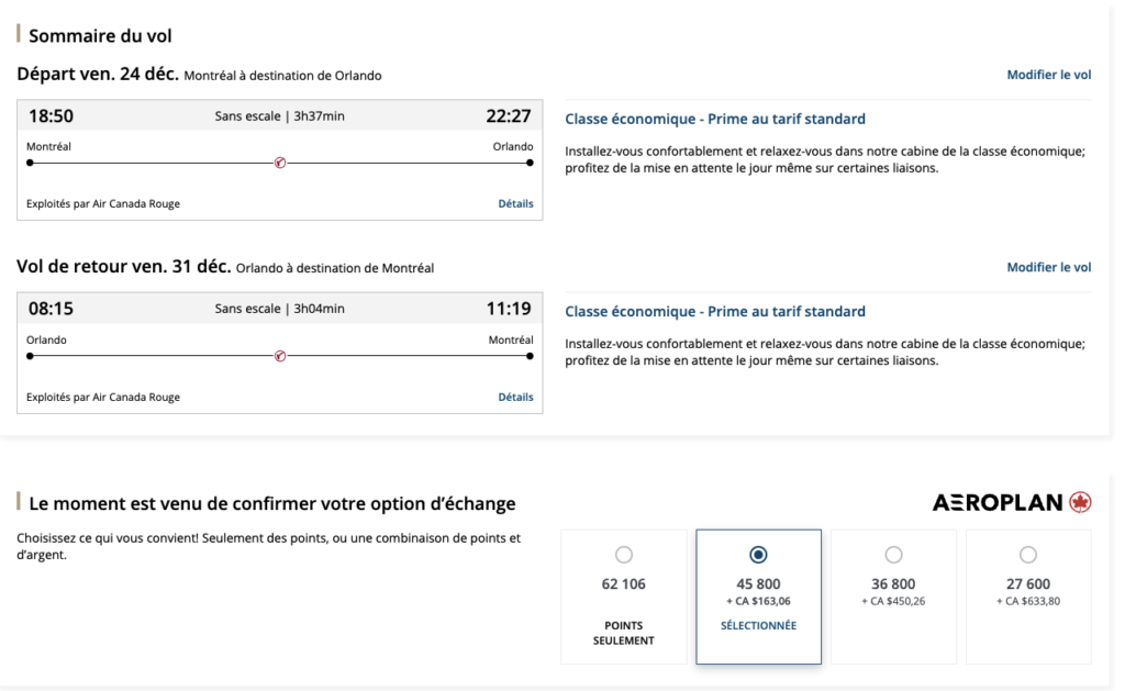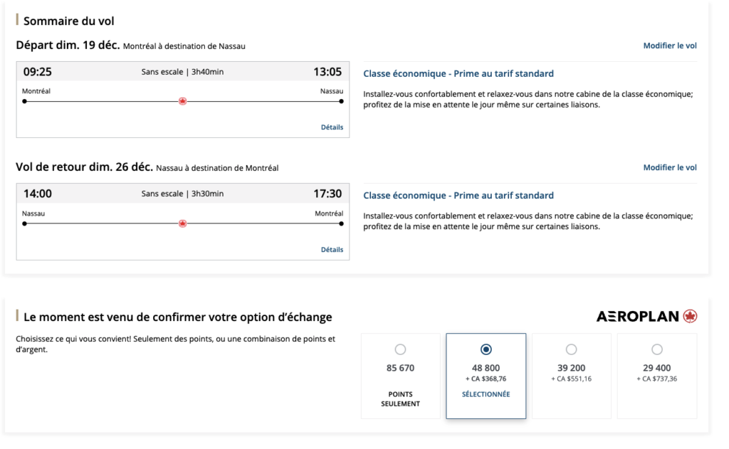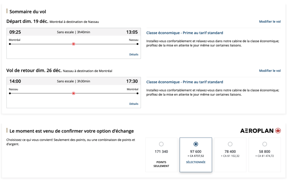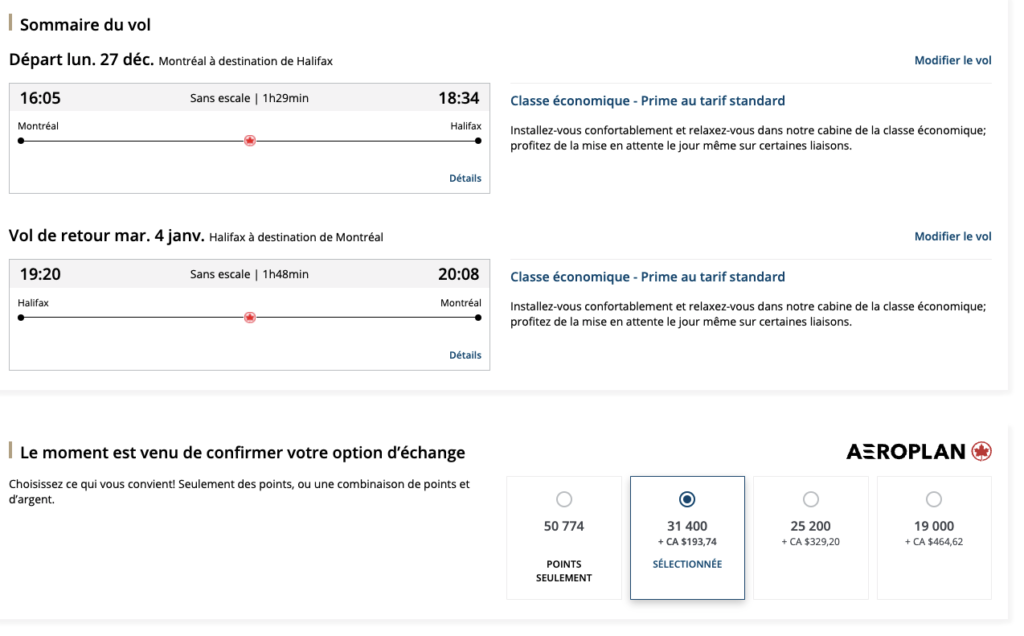 Two people can go directly from Montreal to Montego Bay on December 31. It would cost 35,000 Aeroplan points and $392.70.