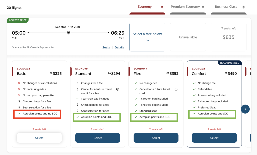 Note that Basic Economy class tickets do not earn any SQC, which makes them less attractive for travellers aiming for Aeroplan Elite status.