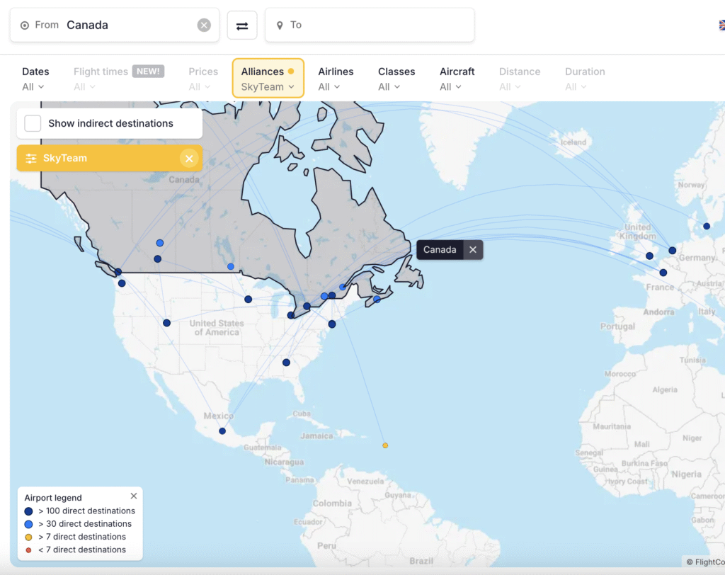 From Canada, direct flight options within SkyTeam are also very limited. At present, there are only two routes: