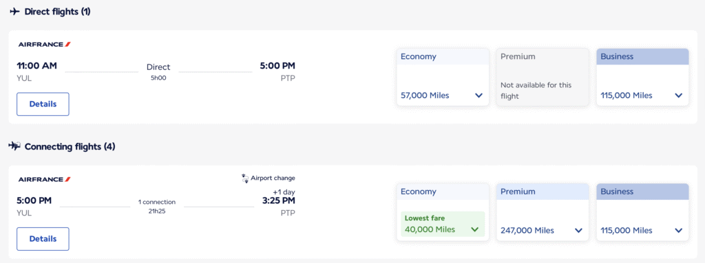 Please note: Air Canada’s direct flight to Pointe-à-Pitre, although accessible via Aeroplan, is also subject to dynamic pricing. There’s no guarantee that you’ll find it at the lowest price of 12,500 points. In this context, Flying Blue may represent a viable alternative, especially if you have earned miles with an American Express Membership Rewards card (1:0.75 transfer) or with a Flying Blue card. Air France KLM World Elite Mastercard®.