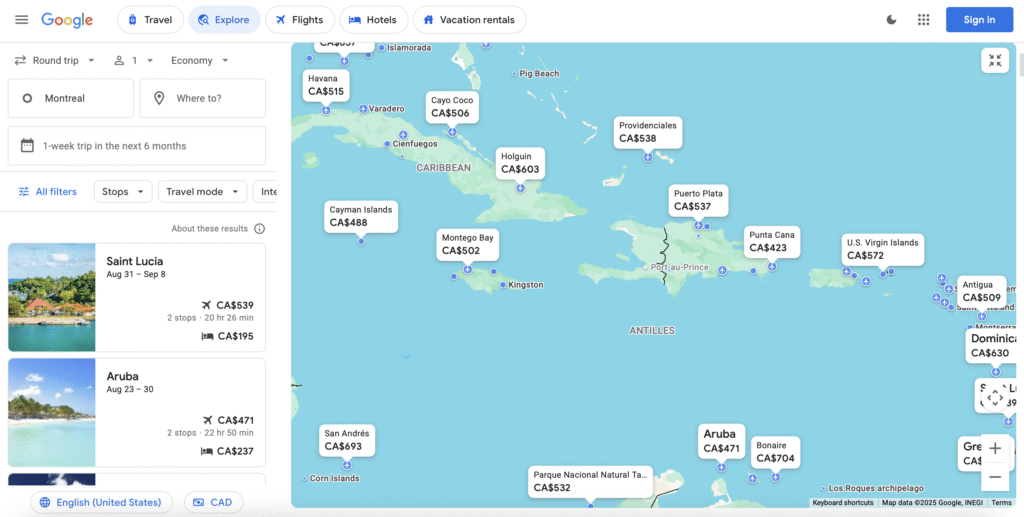 What’s more, Google Flights ‘ “Explore” function is particularly useful for identifying the most advantageous periods and low-cost destinations at a glance, as shown in the screenshot below.