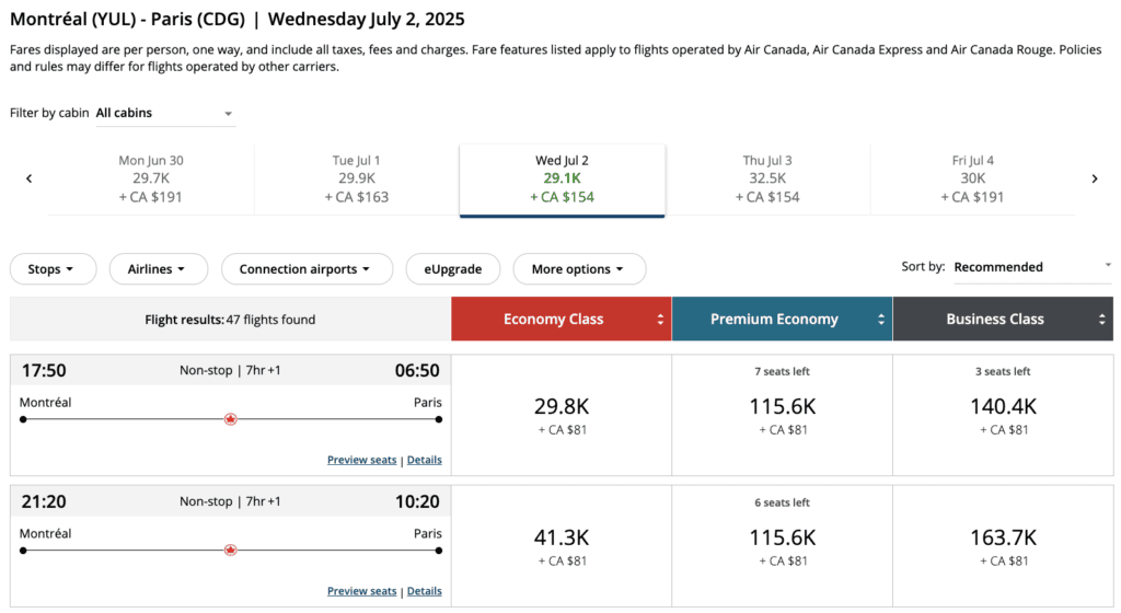 A price in Aeroplan points + cash is displayed: this price corresponds to the lowest fare in points plus the airport taxes. For example, on July 2, 2025, a non-stop one-way flight in economy class is shown at 29,800 Aeroplan points + $81 in taxes.
