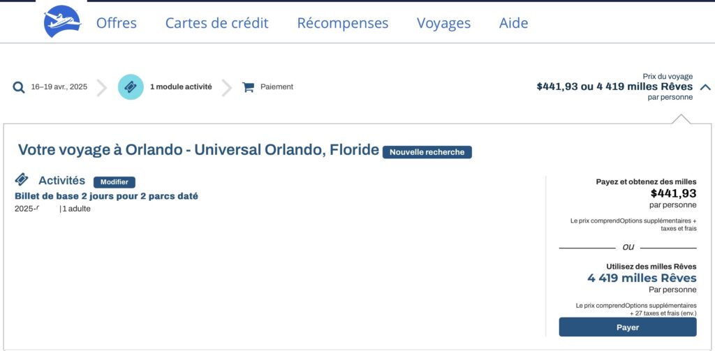 The AIR MILES program allows you to purchase park tickets for Universal Studios in Florida. To accumulate miles quickly, I combined various promotions (such as “Shop the Block,” offers with up to 40% off mile redemptions, etc.) and signed up for the BMO AIR MILES World Elite Mastercard.