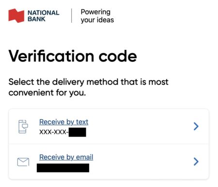 Here’s an example of a screenshot illustrating two-factor authentication for a National Bank account, whether to access the online banking platform or to access à la carte Rewards to redeem your points.