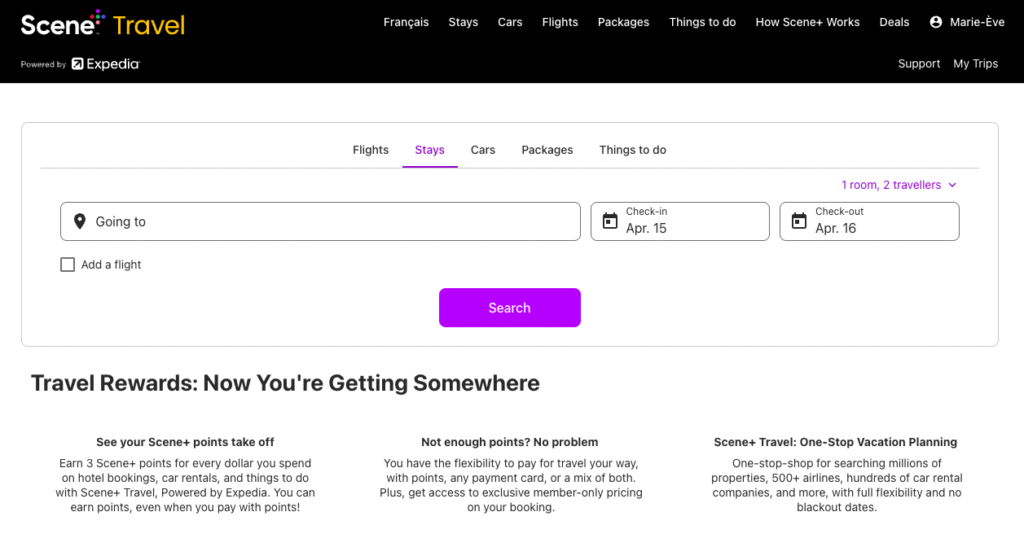 This brings you to the Expedia site for Scene+. Do your search the same way you would with Expedia.ca.