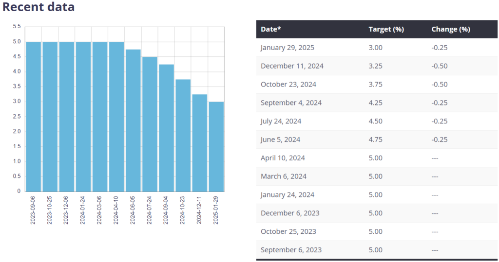 On January 29, 2025, the Bank of Canada (BoC) decided to reduce its policy interest rate to 3% with a further cut of 25 basis points. This is a sixth consecutive decline. Furthermore, it announces the end of quantitative tightening so that its balance sheet can stabilize and then begin to grow in line with the growth of the economy. Since June 2024, the BdC’s policy interest rate has fallen from 5% to 3%.