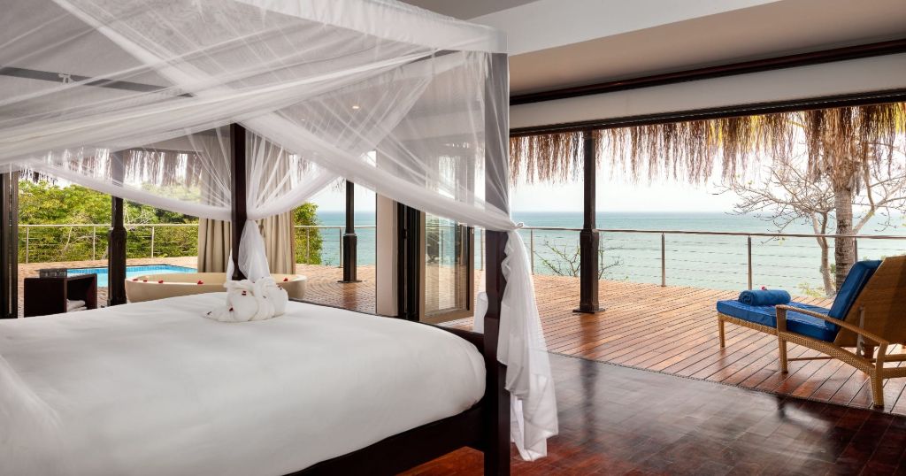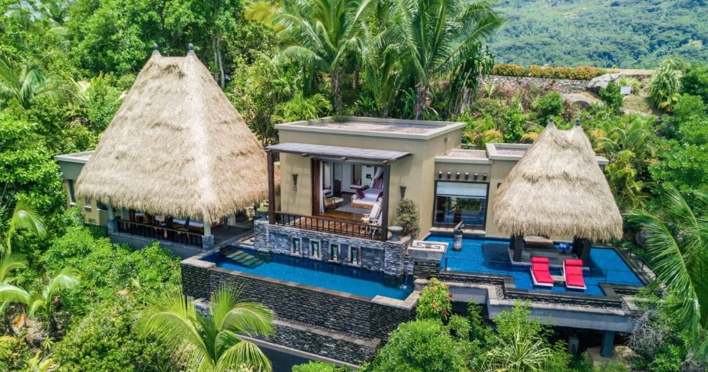 Anantara Maia Seychelles Villas offers a luxurious setting with 30 private villas, each with a swimming pool and views of the ocean and lush gardens. The villas harmoniously integrate natural elements and elegant furnishings.