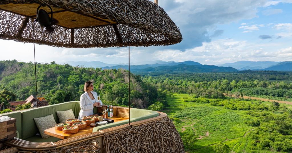 Guests can explore the ruins of lost cities, take sidecar rides through the countryside, or rejuvenate in a tranquil temple. The experience continues with encounters with elephants, spa treatments inspired by local traditions, cruises on the Mekong River, and a unique dinner in the trees with spectacular views.