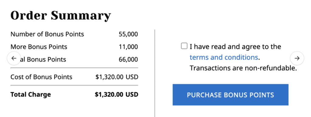 The normal annual points purchase limit is 55,000 points per account per calendar year. What’s more, the minimum purchase is 3,000 points for a transaction to get the bonus.