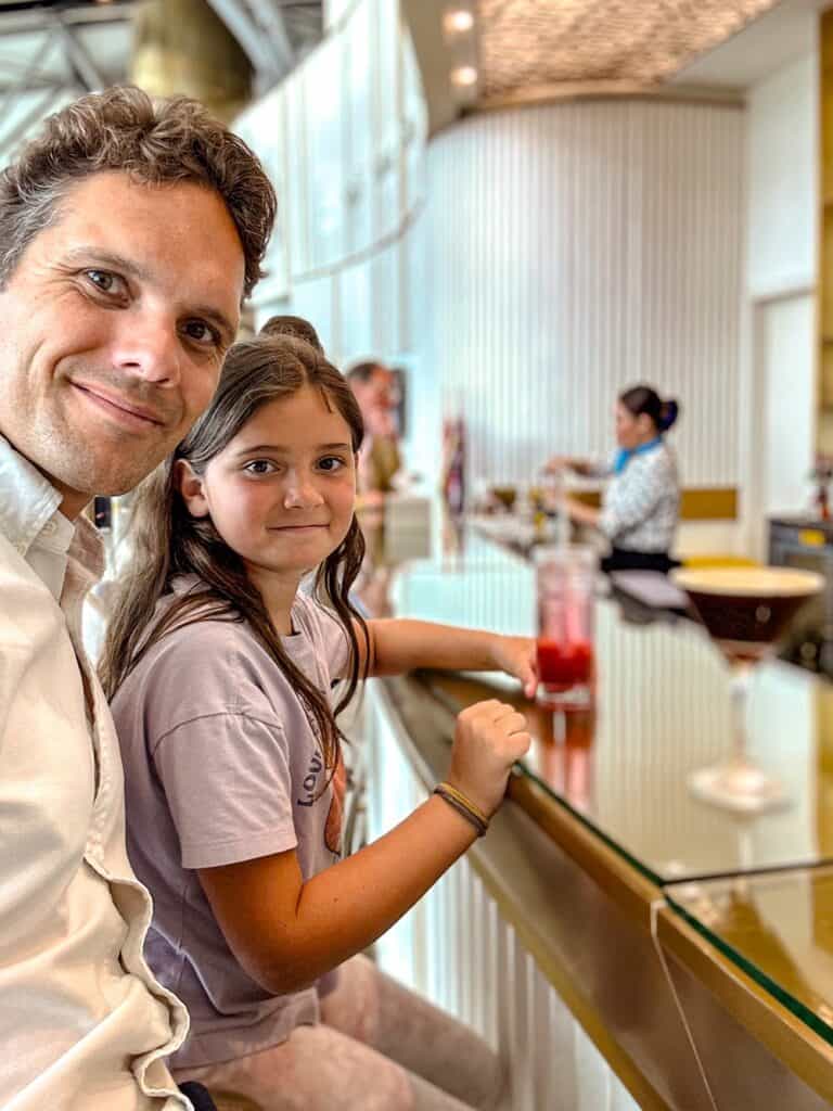 The Oman Air First & Business Lounge is very elegant and comfortable. When I visited with my daughter Alexandra, it was quite busy. An outdoor access area allows for tarmac views. The food was rather standard, which was a bit disappointing as I had higher expectations for the quality. Nonetheless, it remains a very decent lounge to relax in before a flight.