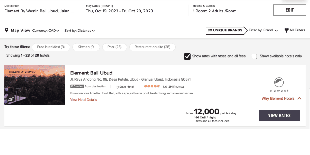 Here’s the example of the Element by Westin Bali Ubud hotel booked for 5 consecutive nights: that’s 46,000 points instead of 57,000!