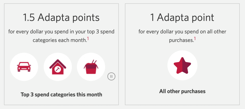 The truly unique thing about this card and its earning rates is that the elevated earning rate gets adapted each month. This feature makes sure that you’re earning the extra 0.5 Adapta points per dollar spent on whichever categories you happen to spend the most in that month.