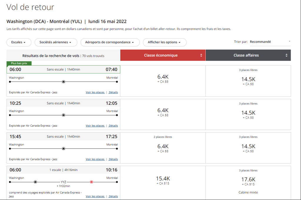 For the flight, you can use Aeroplan points to purchase your ticket. In economy class, the flight starts at 6,000 points for a one-way trip between Montreal and Washington-Dulles, according to the points predictor.